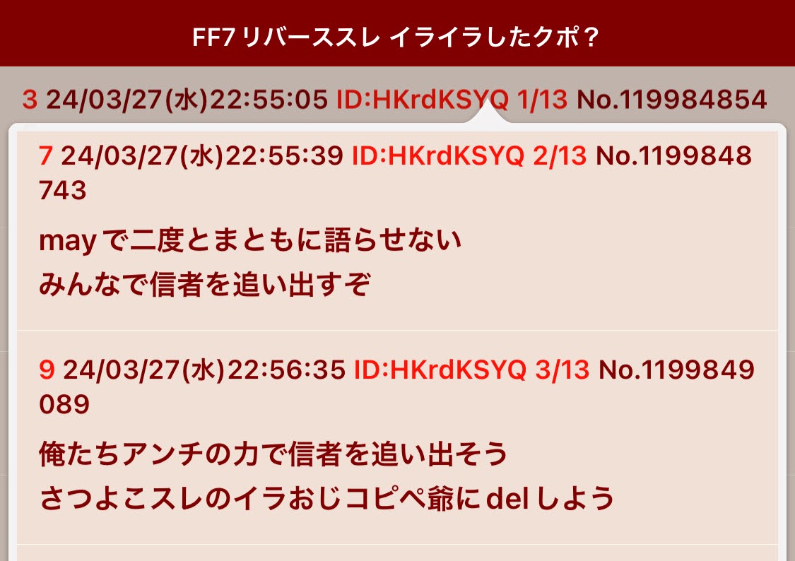 | … | 212無念Nameとしあき26/03/24(火)12:27:22No.1396008313+(フリキチやニュー速気取りで暴れてるボケ老人もさっさと屠殺してくれないかな...) |