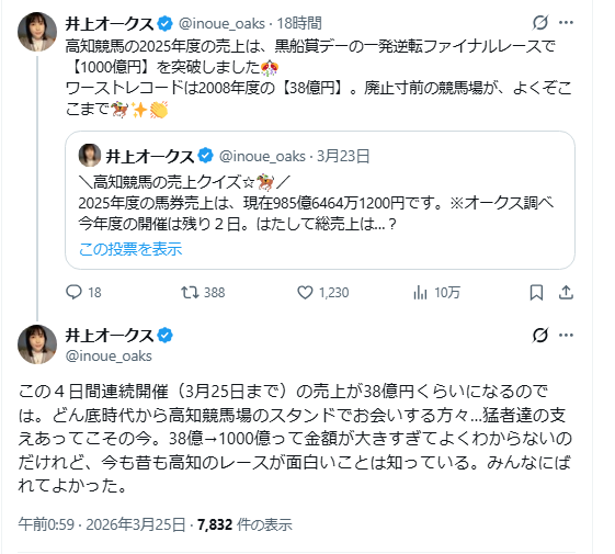 | … | 846無念Nameとしあき26/03/25(水)19:44:36No.1396310339+武豊は終わった…言われだしたらそろそろ何かデカいの勝ちそうだなとなる競馬民 |