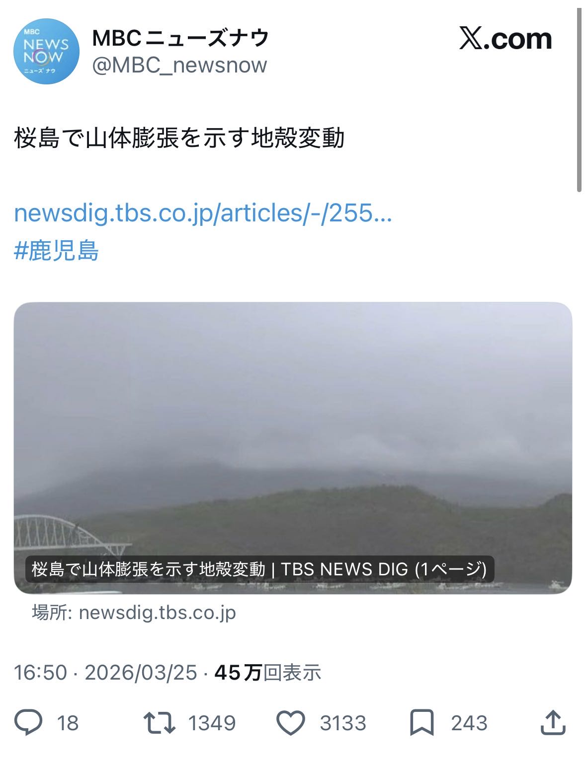 | … | 8無念Nameとしあき26/03/26(木)00:21:15No.1396378616そうだねx1桜島じゃなくて錦江湾が膨らんできたら起こしてくれ |