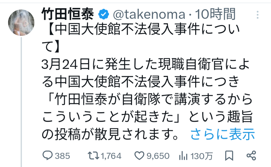 | … | 3無念Nameとしあき26/03/26(木)06:46:55No.1396400351そうだねx1中国大使館に刃物持って怒鳴り込んだり自衛隊やりたい放題だな |