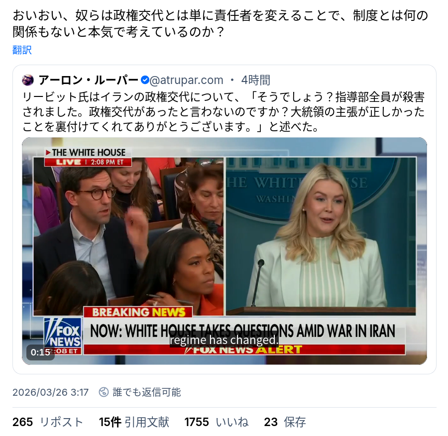 | … | 116無念Nameとしあき26/03/26(木)11:43:05No.1396430433+現イランで意志決定をしているのは革命防衛隊だそうだから |