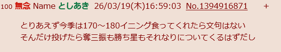 | … | 46無念Nameとしあき26/03/27(金)01:24:29No.1396587937+先発で3勝できたら上出来 |