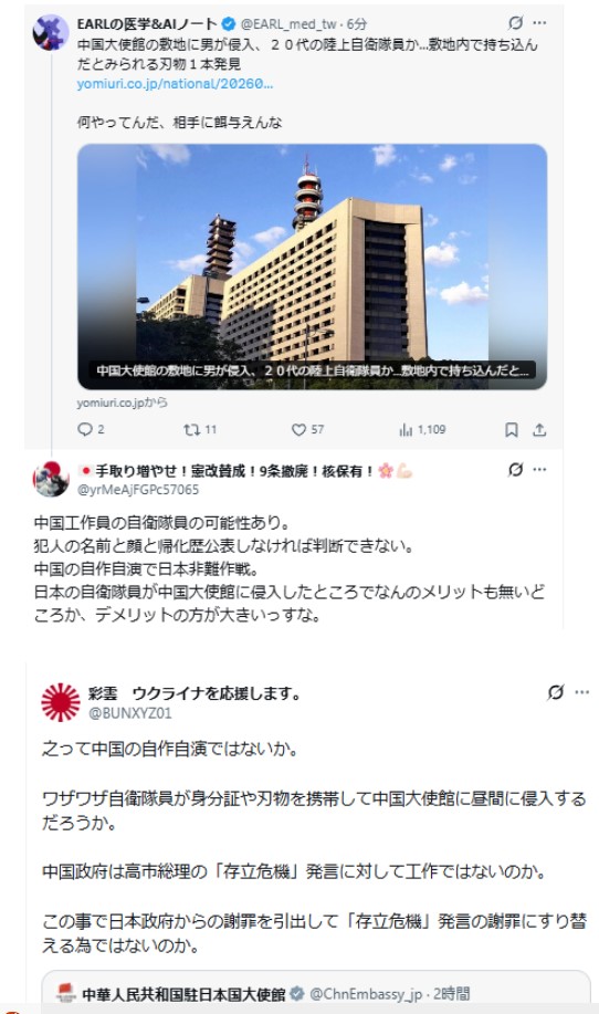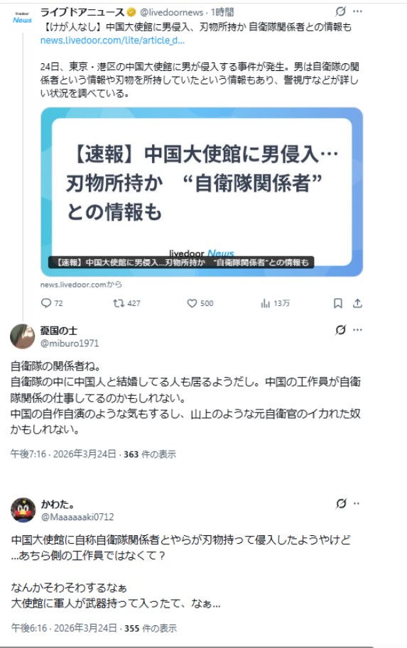 恒例行事、X民が例の自衛官の中国大使館侵入事件は