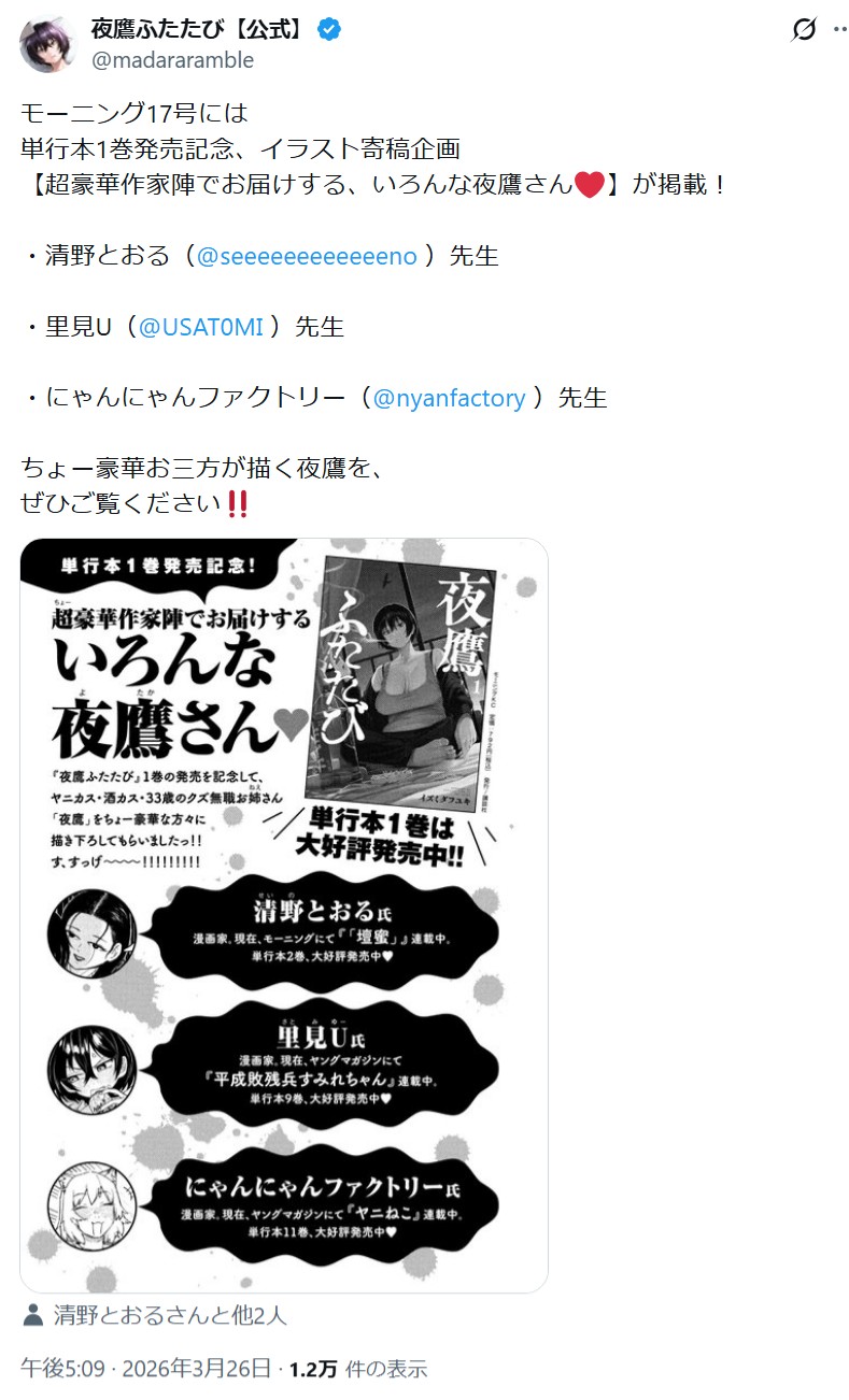 | … | 27無念Nameとしあき26/03/27(金)02:06:48No.1396591185+>今売ってるモーニング最新号で書きおろしイラストのってるニャ |