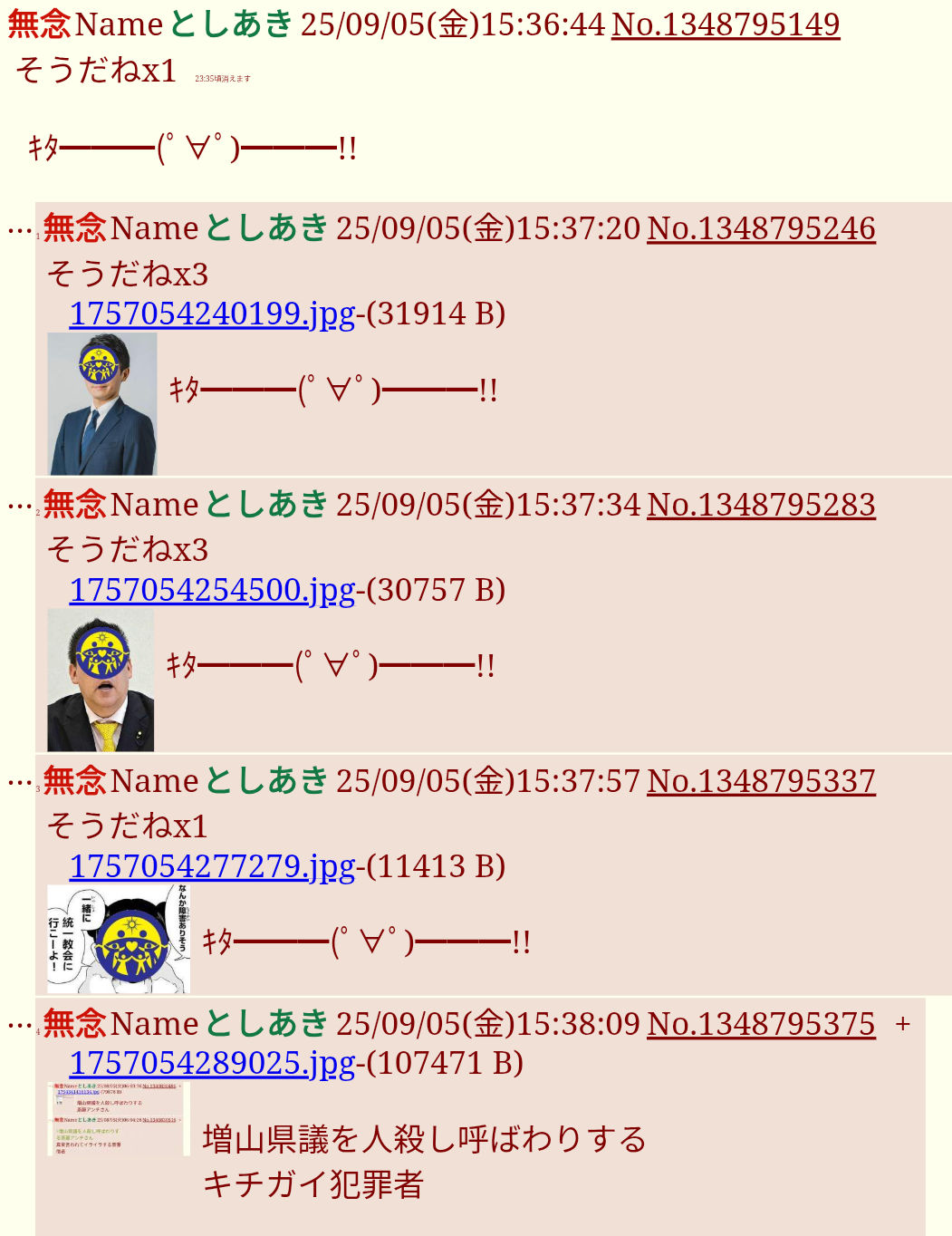 | … | 2無念Nameとしあき26/03/27(金)04:53:58No.1396598208+ 1774554838852.jpg-(241874 B) 増山県議を人殺し呼ばわりしてるバカはそんなもんじゃすまなさそう |