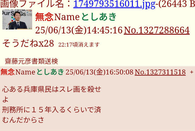| … | 94無念Nameとしあき26/03/27(金)07:46:54No.1396608366+>斉藤知事を殺してこいと威力業務妨害と殺人教唆してるキチガイも30万じゃ済まんやろなあ |