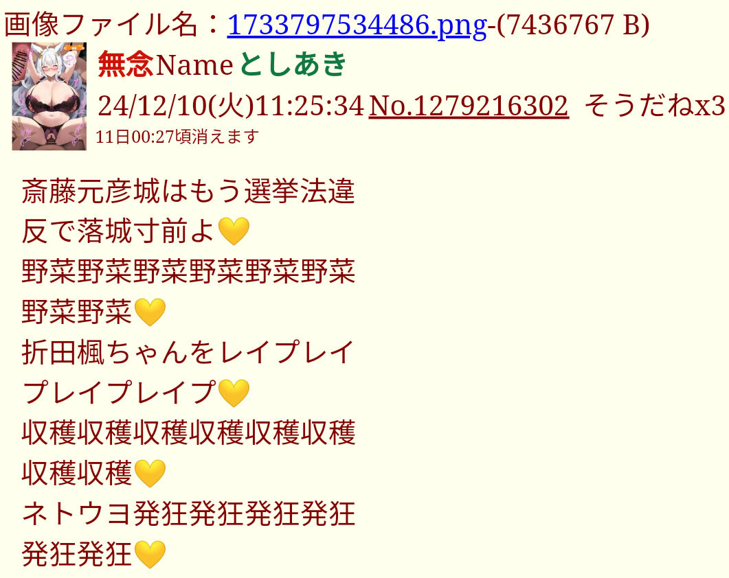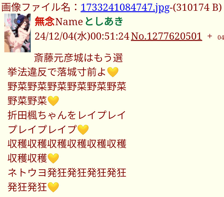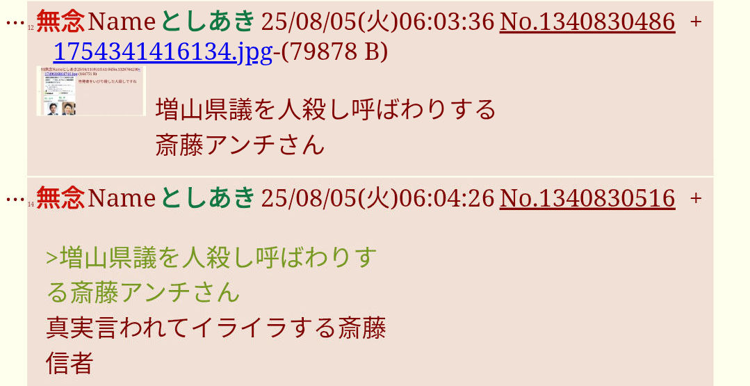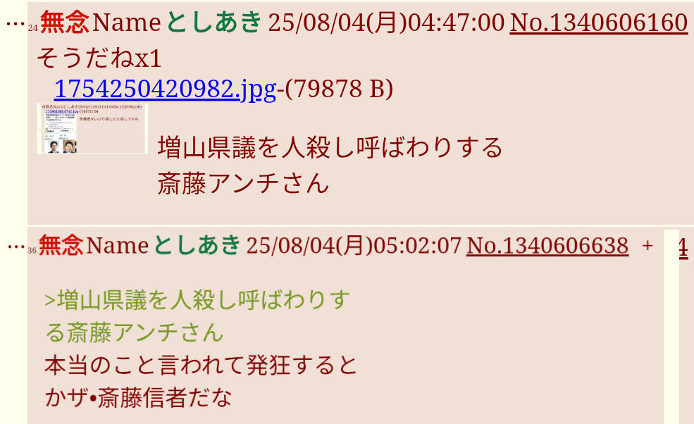 | … | 53無念Nameとしあき26/03/27(金)05:35:41No.1396599474+>>>>増山県議や斉藤知事が犯罪事実を認識するまでお前の犯罪の証拠を貼りまくってやるから楽しみにしとけよ犯罪者 |