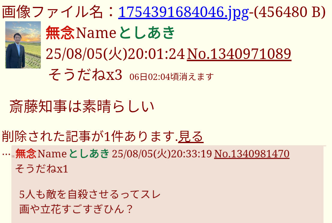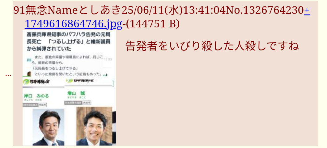 | … | 8無念Nameとしあき26/03/27(金)05:02:47No.1396598453+>>斉藤知事を殺してこいと威力業務妨害と殺人教唆してるキチガイも30万じゃ済まんやろなあ |