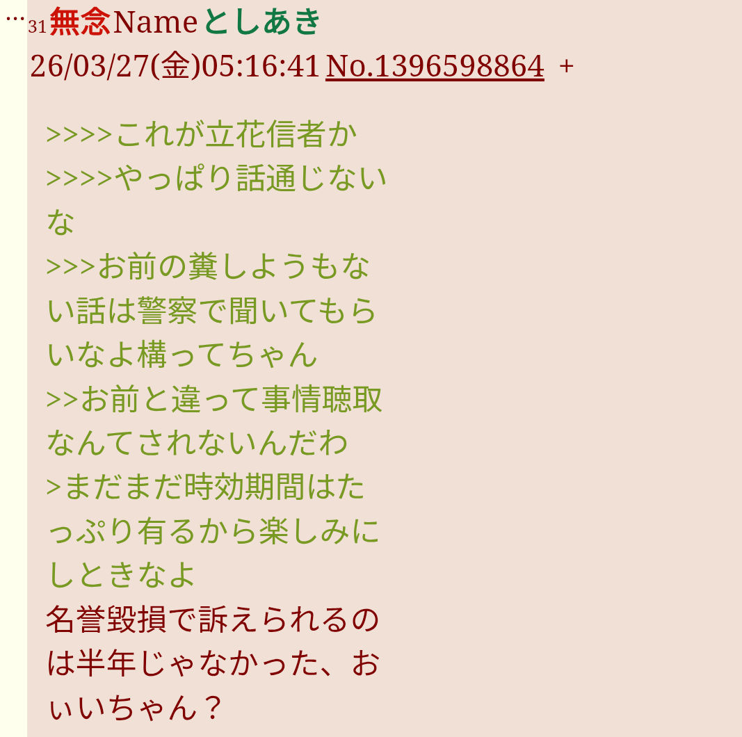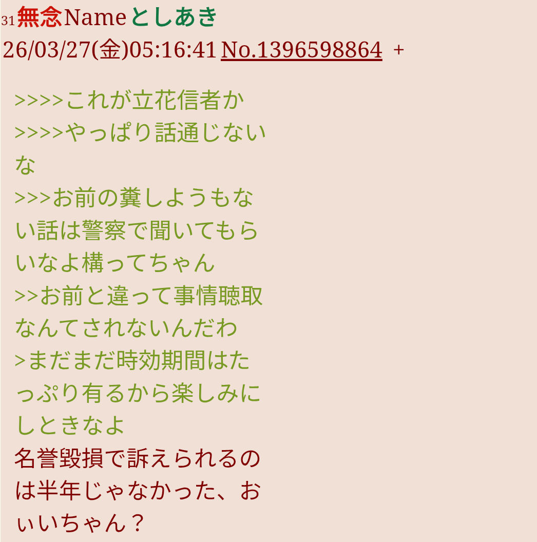| … | 45無念Nameとしあき26/03/27(金)05:32:17No.1396599354+犯罪者レスとやらを反立花がレスしたって証拠出さないとな |