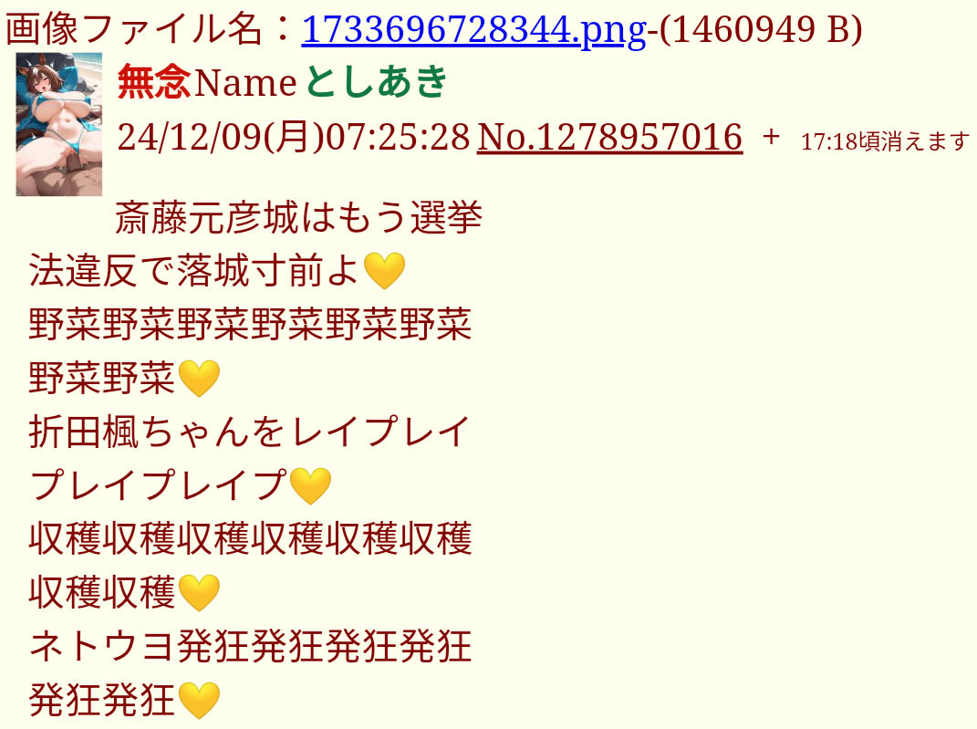 | … | 49無念Nameとしあき26/03/27(金)05:33:48No.1396599409+>>増山県議や斉藤知事が犯罪事実を認識するまでお前の犯罪の証拠を貼りまくってやるから楽しみにしとけよ犯罪者 |