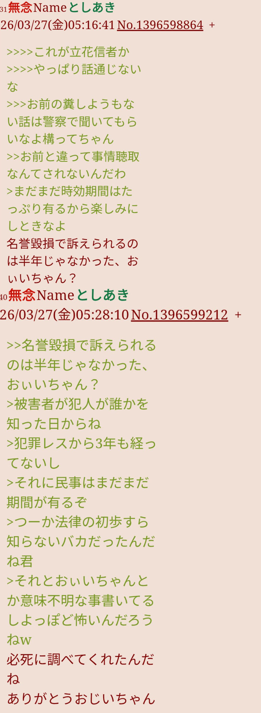 | … | 36無念Nameとしあき26/03/27(金)05:21:13No.1396599003+>名誉毀損で訴えられるのは半年じゃなかった、おぃいちゃん? |
