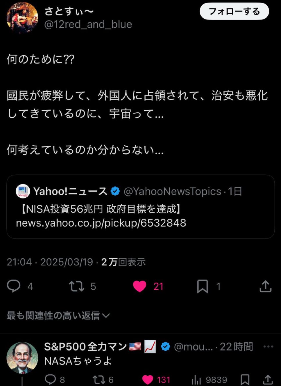 | … | 38無念Nameとしあき26/03/27(金)07:40:07No.1396607719+ツイフェミで有名な赤りんご氏は去年の年末でNISAすべて積み終わったらしいぞ! |