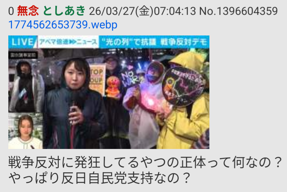 | … | 21無念Nameとしあき26/03/27(金)07:40:02No.1396607710+皆、戦争反対には賛同してる |