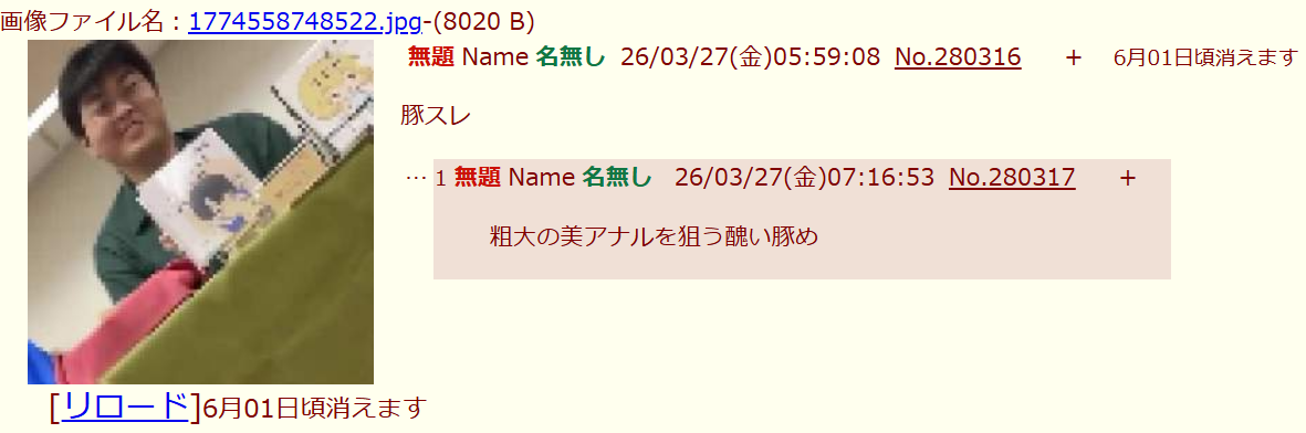 | … | 4無念Nameとしあき26/03/27(金)08:36:26No.1396614279+下痢ぶーちゃんどうした?お母さんに殺されそうなのか |