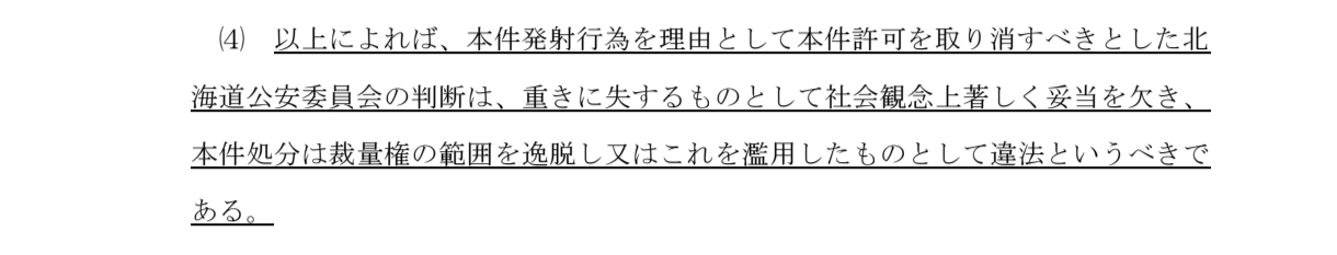 | … | 78無念Nameとしあき26/03/27(金)23:09:18No.1396790658そうだねx10 1774620558177.jpg-(71819 B) >北海道公安委員会の判断は、重きに失するものとして社会観念上著しく妥当を欠き、本件処分は裁量権の範囲を逸脱し又はこれを濫用したものとして違法というべきである。 |
