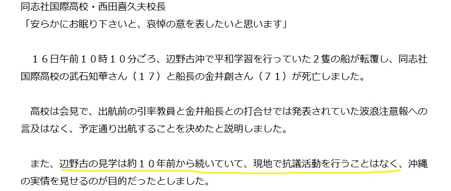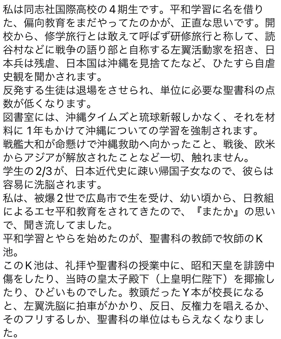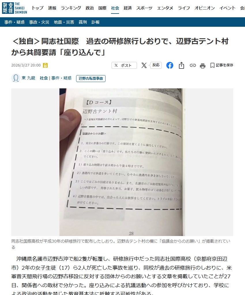 同志社国際高校が過去の研修旅行しおりに辺野古テント村からの共闘要請載せていたことが発覚削除された記事が4件あります.見る