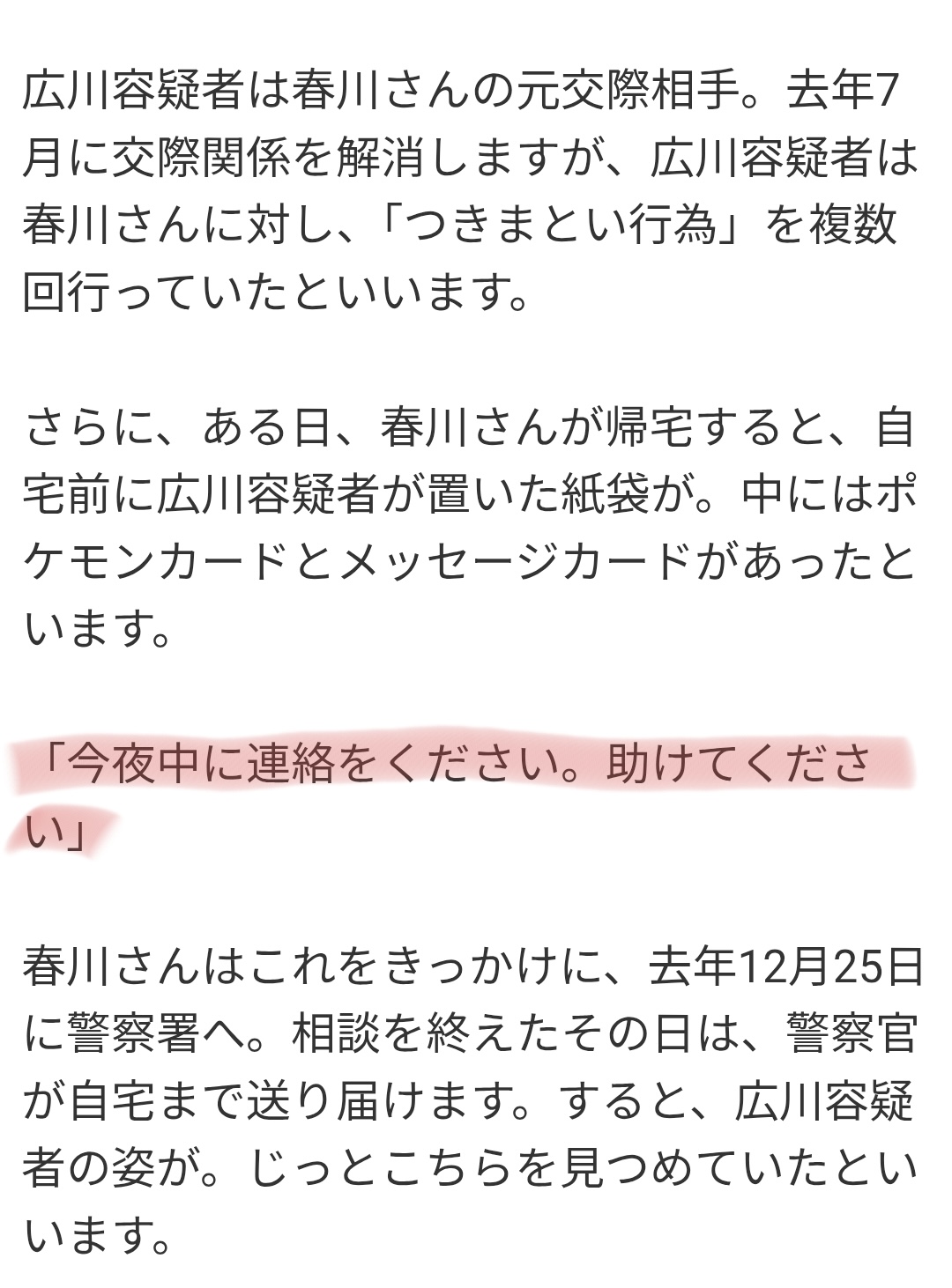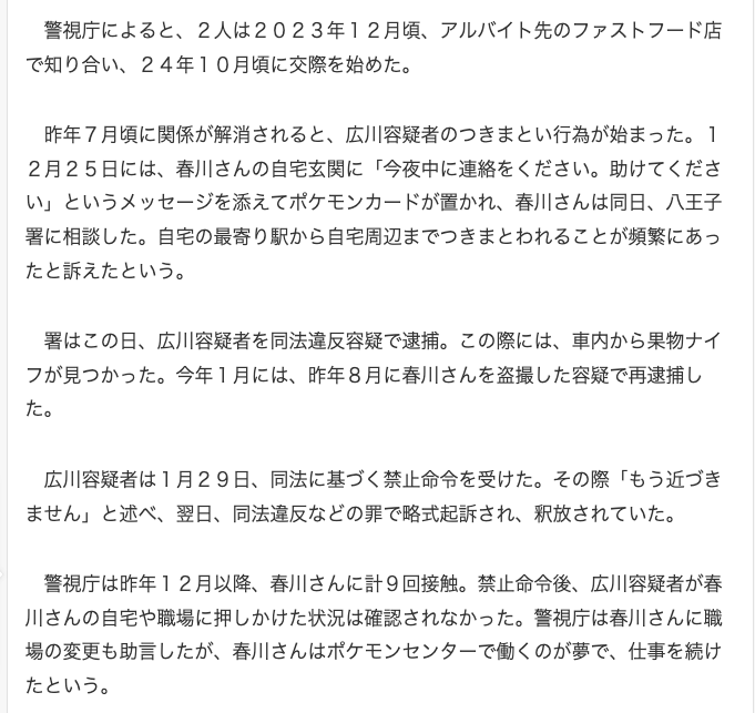 | … | 85無念Nameとしあき26/03/28(土)01:24:54No.1396817930そうだねx1エスパーじゃなくても過去の例からストーカー被害はほぼ殺人になるんだから対処しろよ |