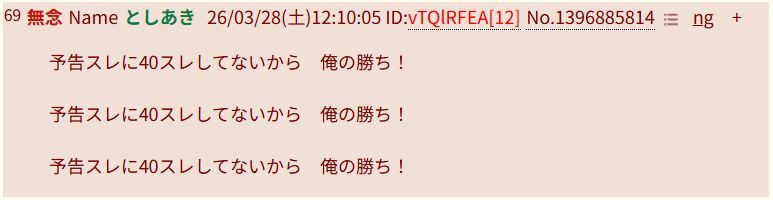 | … | 43無念Nameとしあき26/03/28(土)14:19:34No.1396912446+これも同じスレ豚 |