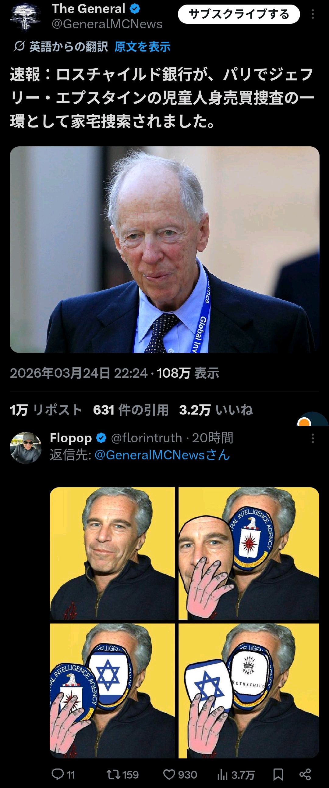 | … | 16無念Nameとしあき26/03/29(日)00:13:29No.1397056589そうだねx1 1774710809965.jpg-(1200570 B) あのロスチャイルド銀行にエプスタインで捜査突入! |