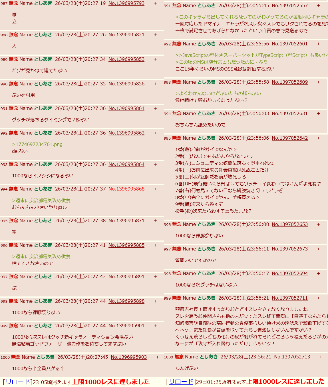| … | 94無念Nameとしあき26/03/29(日)00:30:39No.1397060260+さっきのは割と話し転がって1000にいった印象ぶい |