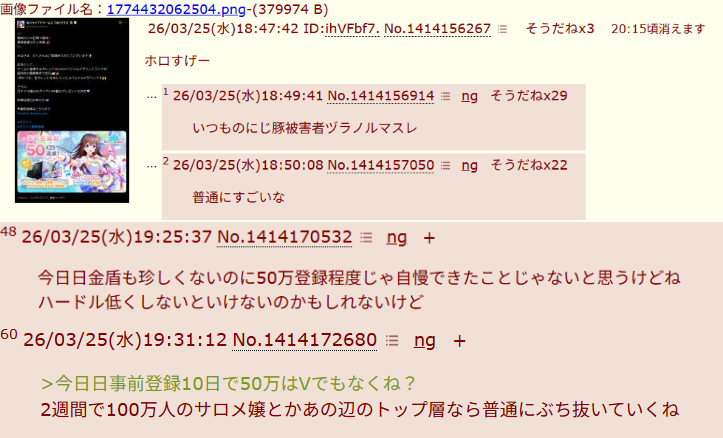 | … | 191無念Nameとしあき26/03/29(日)09:18:19No.1397112643+ 1774743499925.png-(181605 B) >事前登録50万人突破したそうで楽しみですよねホロドリ |