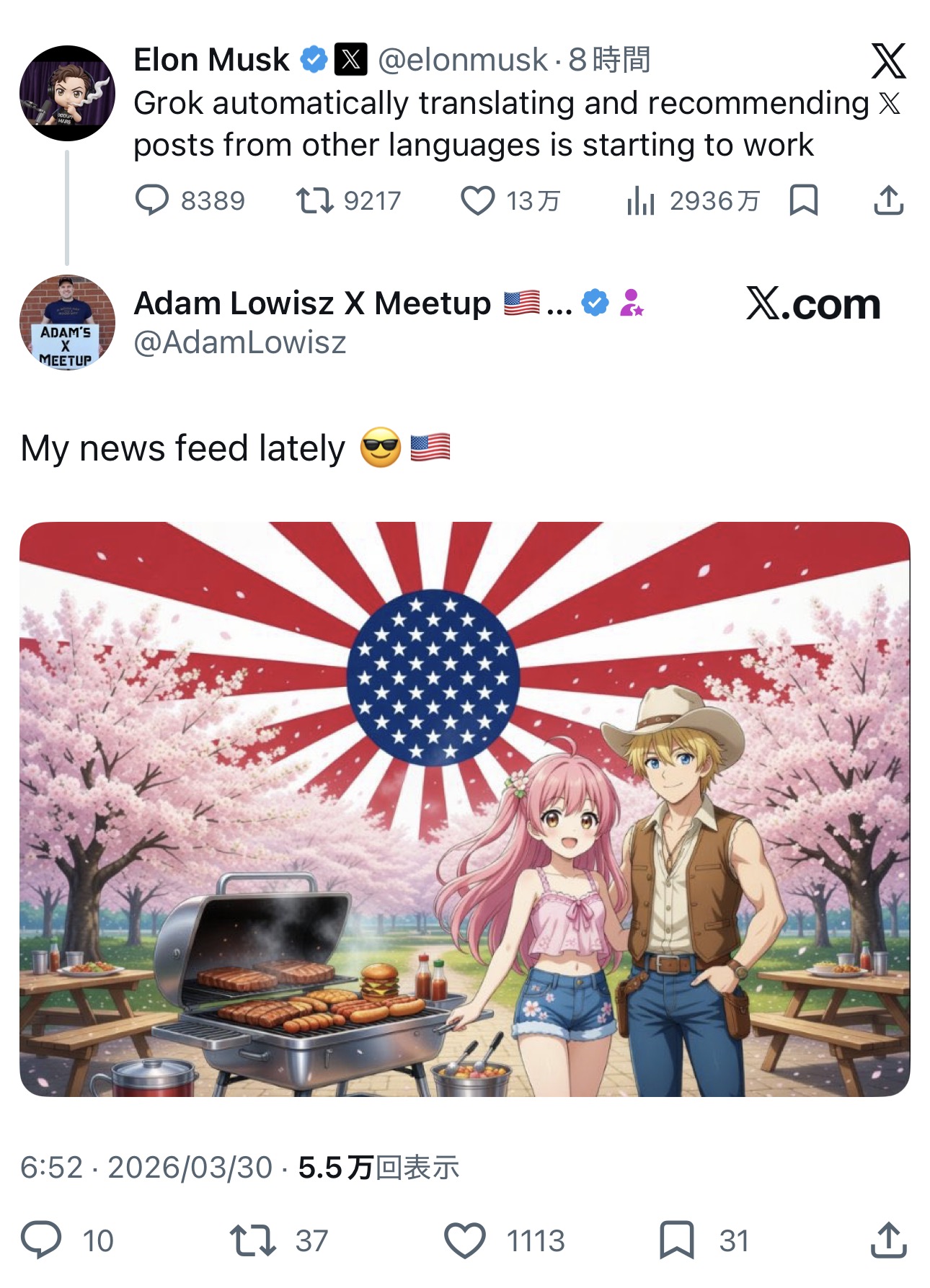 | … | 20無念Nameとしあき26/03/30(月)15:31:03No.1397427646そうだねx1最近XでやたらとBBQの画像がオススメにでてくるようになったんだがアルゴリズムが変わって日米間でオススメ流れるようになったらしい |