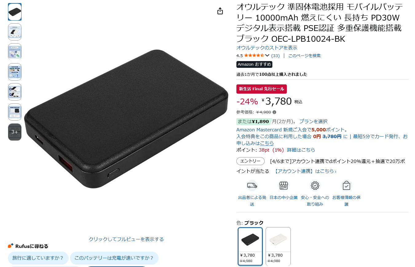 | … | 72無念Nameとしあき26/03/31(火)00:47:39No.1397548839+ 1774885659814.png-(336430 B) 前回のセール後売り切れてたオウルテックの準個体モバイルバッテリが復活してたわよ |