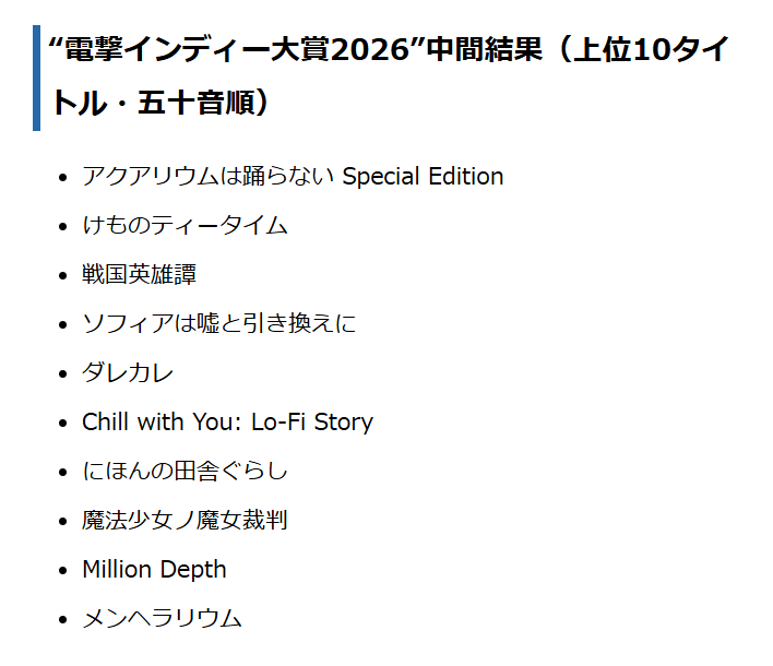 | … | 35無念Nameとしあき26/03/31(火)20:43:37No.1397710909そうだねx2 1774957417929.png-(44275 B) インディー大賞やってるけどいいラインナップだ |