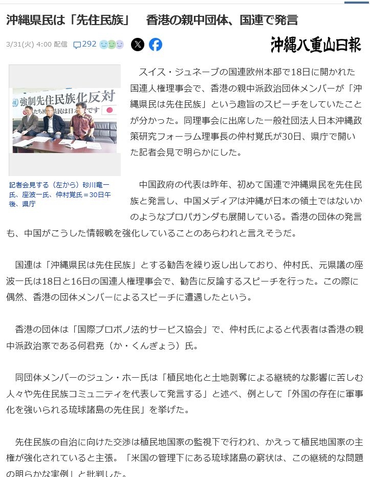 | … | 9無念Nameとしあき26/03/31(火)20:37:17No.1397709034そうだねx15香港人が沖縄を代表して先住民族との訴えって国連もはやギャグか |