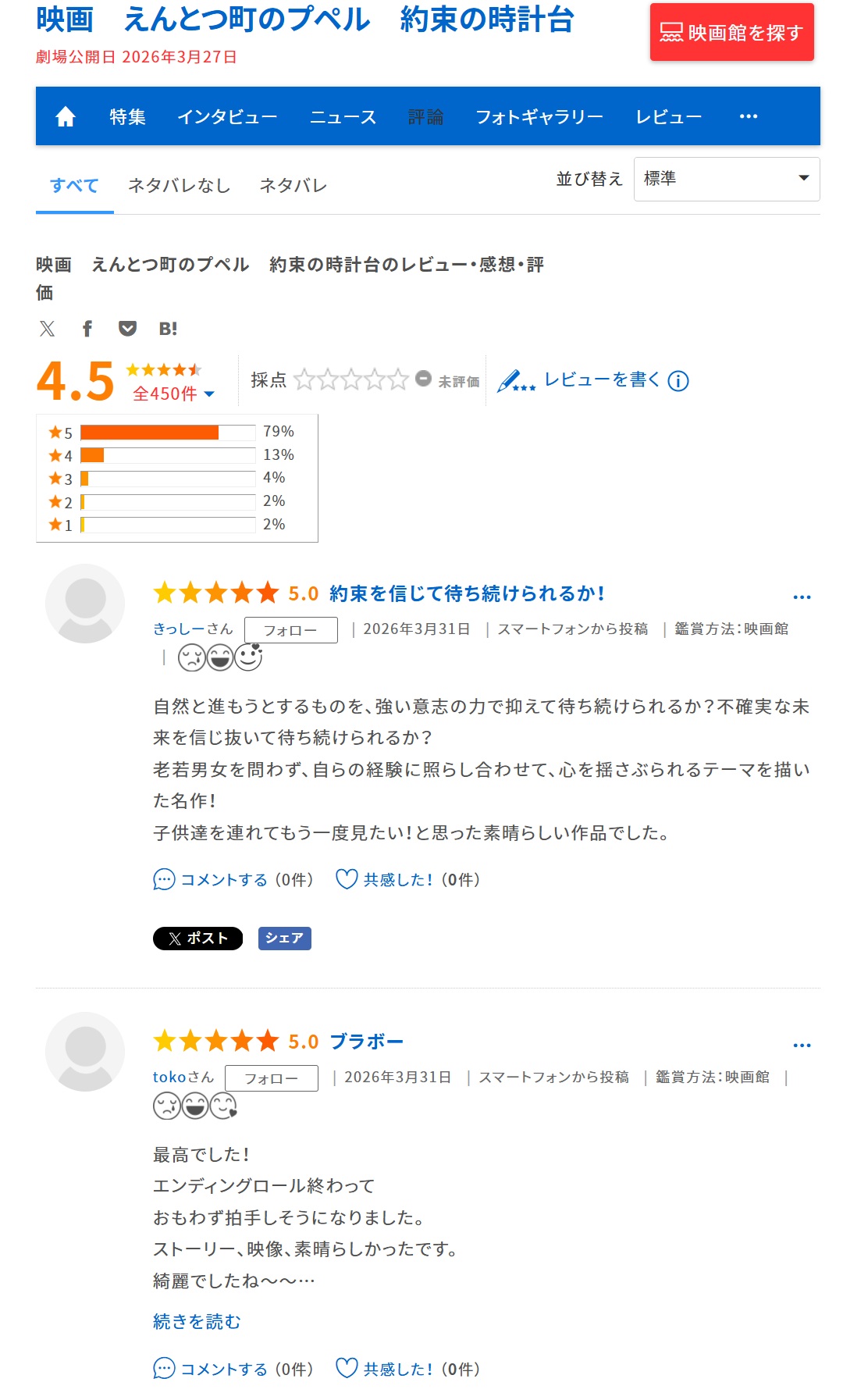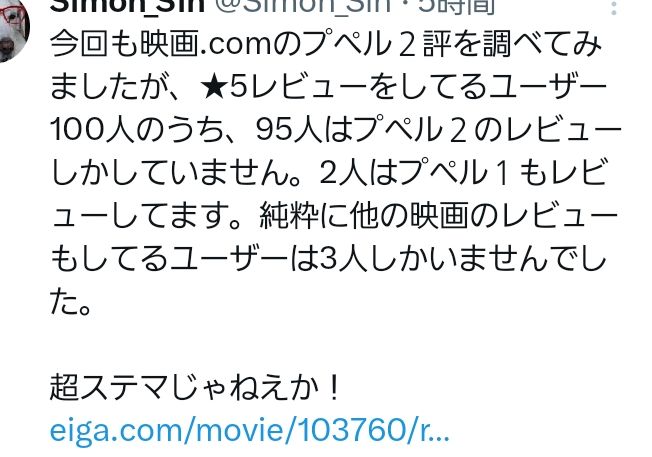 | … | 50無念Nameとしあき26/03/31(火)22:18:03No.1397738051そうだねx1>こないだの土曜日に急にfilmarksに100人の新規アカウントが作られて全員プペ2に☆5評価付けてほめちぎってんのあからさま過ぎて笑った |