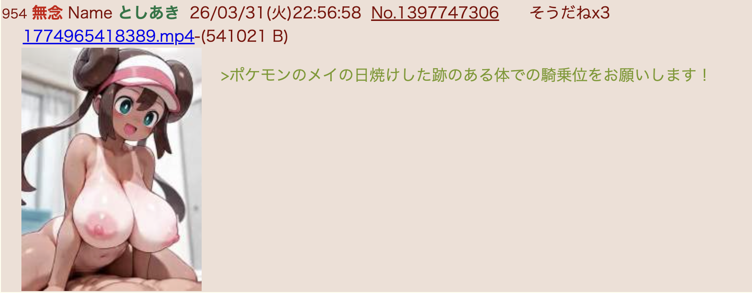 | … | 39無念Nameとしあき26/03/31(火)23:11:14No.1397750518+ 1774966274117.png-(435590 B) 前スレポケモンのメイの日焼けした跡のある体での騎乗位を生成ありがとうございました! |
