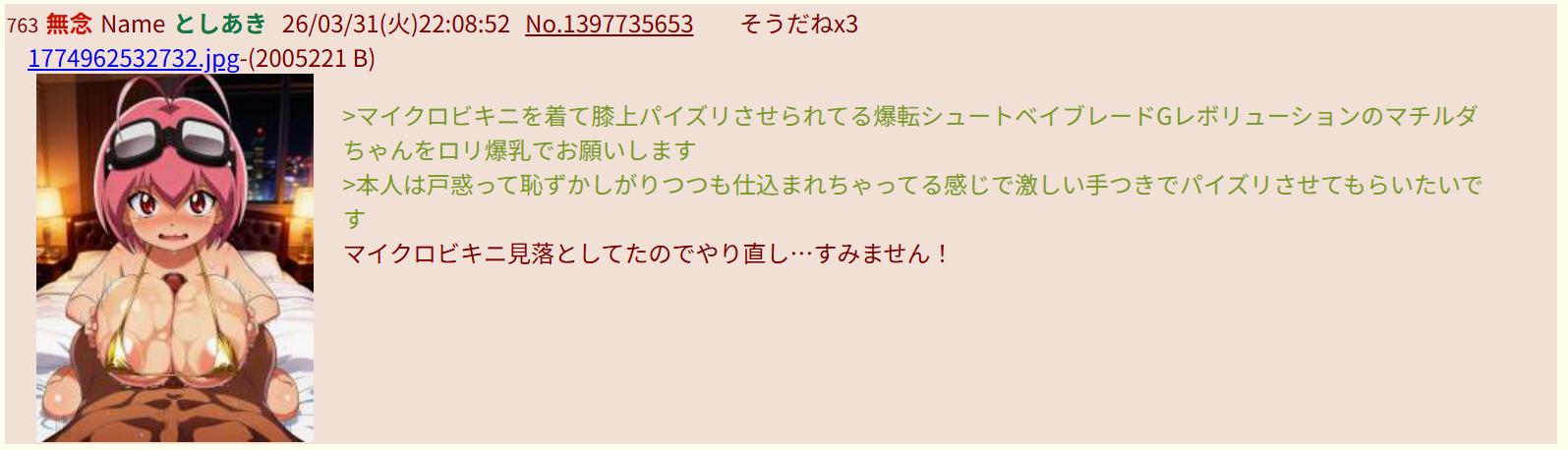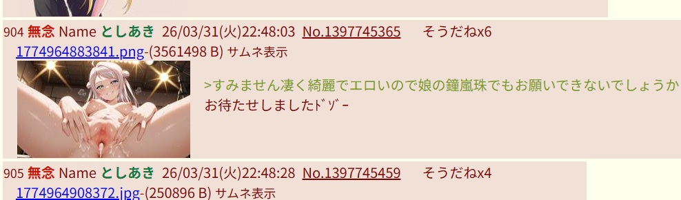| … | 523無念Nameとしあき26/04/01(水)02:11:51No.1397777634+>エスパーなので先にリクエストに応えておきますね |