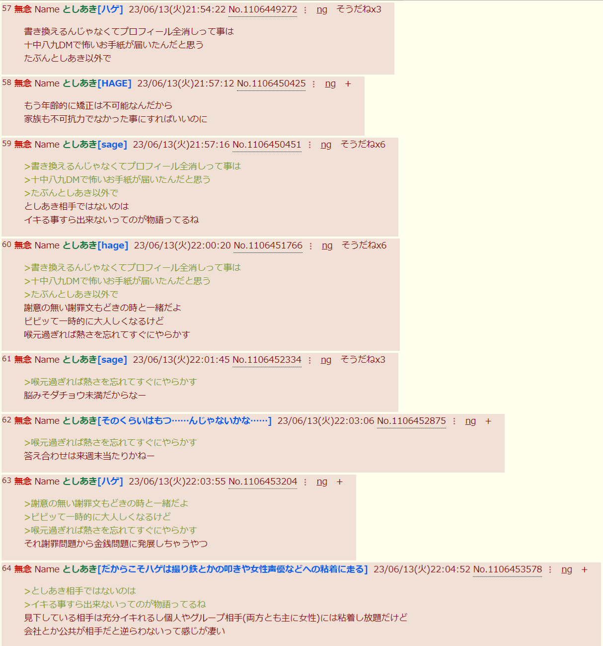 | … | 93無念Nameとしあき26/04/01(水)00:08:14No.1397761316そうだねx1としあき達はこいつらを馬鹿にしてるけど自分もこいつらと完全に同じパソコンと趣味とネットでの叩きが大好きな非モテ独身中高年だっつーのにな |