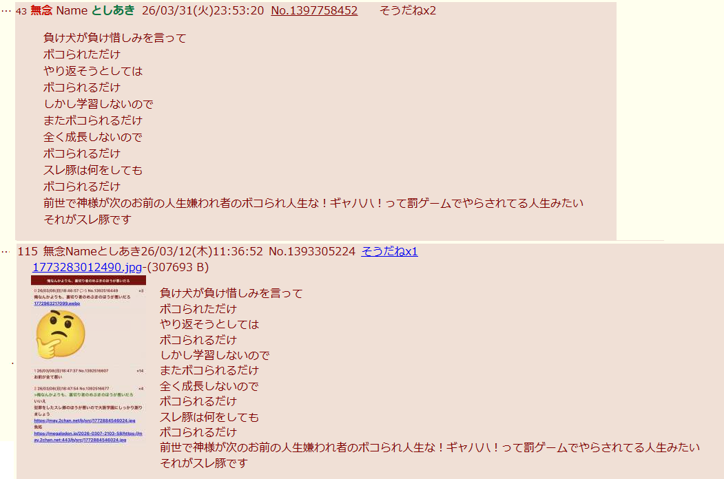 | … | 43無念Nameとしあき26/03/31(火)23:53:20No.1397758452そうだねx2負け犬が負け惜しみを言って |