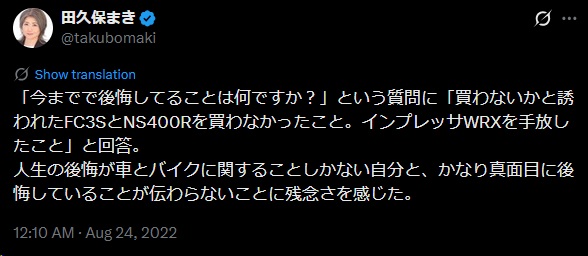 | … | 253無念Nameとしあき26/04/01(水)01:29:00No.1397773608+ 1774974540262.jpg-(55365 B) 「今までで後悔してることは何ですか?」という質問に「買わないかと誘われたFC3SとNS400Rを買わなかったこと。インプレッサWRXを手放したこと」と回答。 |
