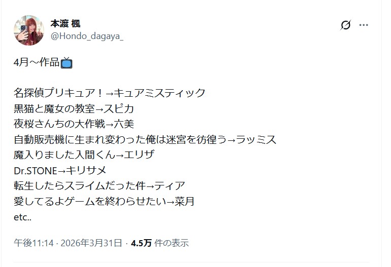 | … | 24無念Nameとしあき26/04/01(水)01:03:54No.1397770495そうだねx1ヨミガエレのフフッフッフーとか特攻DANCEや追い風トラベラーズのオイ!とかたぶんまたたく宇宙に憧れてとか輝いてあたりは田野さんが作中同様一緒にー!って呼びかけると思われる |