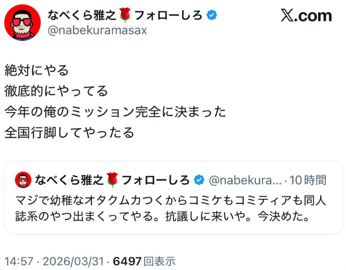 | … | 39無念Nameとしあき26/04/01(水)01:04:54No.1397770642そうだねx22>これやってた左翼がコミケやコミティアで嫌がらせしてやるって宣言してた |
