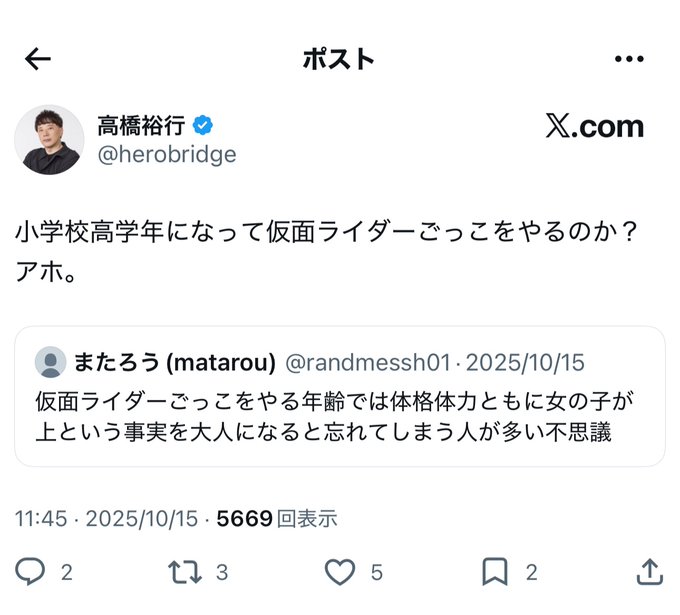 | … | 704無念Nameとしあき26/04/01(水)04:25:35No.1397784643そうだねx5>そんなんだから選挙で歴史的ボロ負けしたという事実から眼を反らす負け犬が何か吠えてる |