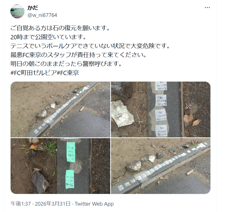 | … | 17無念Nameとしあき26/04/01(水)03:33:29No.1397782115+今日の夜の試合のために置き石とテープで場所取りしているのか |