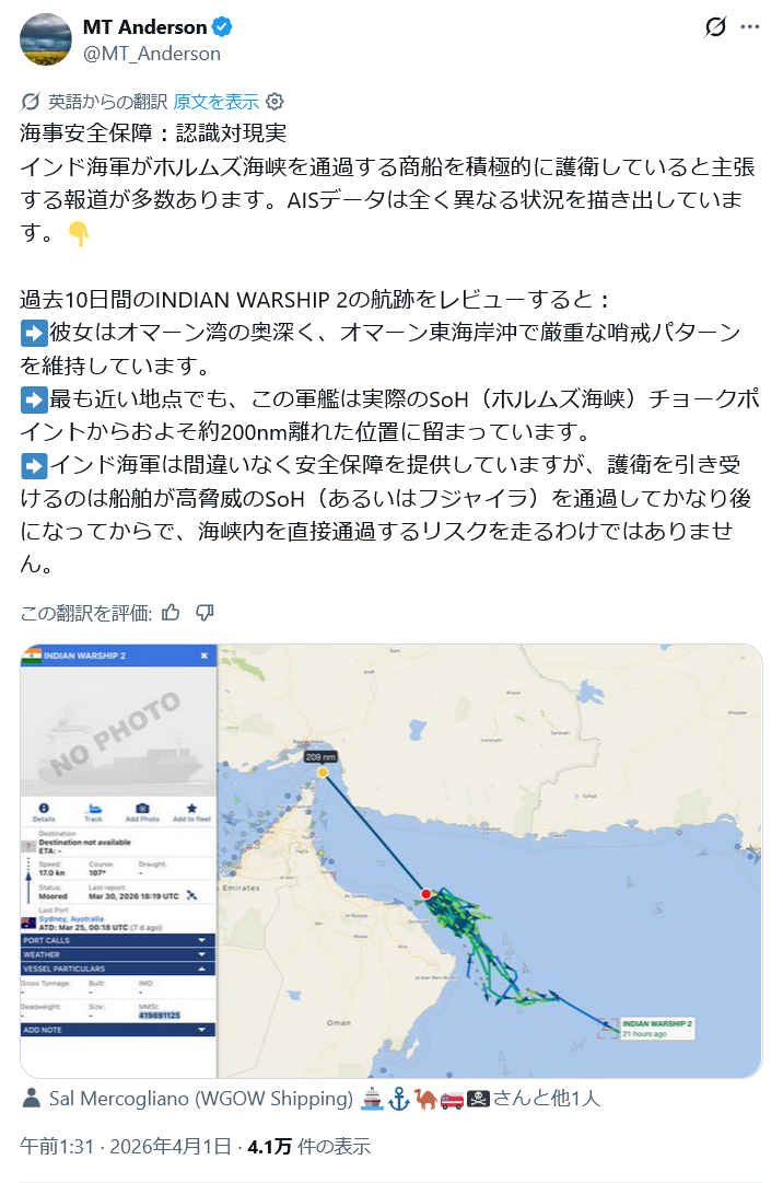 | … | 9無念Nameとしあき26/04/01(水)21:07:14No.1397933538+ 1775045234324.png-(387324 B) インドがある程度独自の海軍による商船保護を行っているのは事実だが戦闘艦を海峡に近づけるようなことはしていないという指摘 |