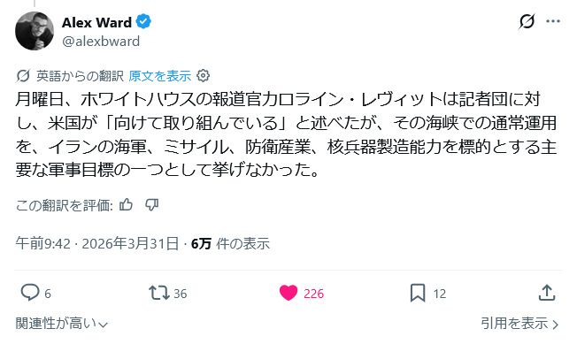 | … | 26無念Nameとしあき26/04/01(水)21:18:53No.1397936727+ 1775045933800.png-(38567 B) トランプ大統領は側近に対し、ホルムズ海峡を再開することなく戦争を終結させる用意があると語った。 |