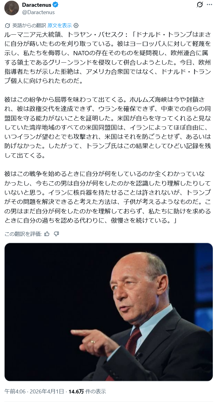 | … | 42無念Nameとしあき26/04/01(水)21:48:19No.1397944816+ 1775047699228.png-(362386 B) ルーマニアのトラヤン・バセスク元大統領は、ホワイトハウスの指導者に対し新たな攻撃を仕掛け、トランプ大統領が中東戦争を誤っただけでなく、アメリカ合衆国の国際関係にも深刻な影響を与えたと主張した。 |