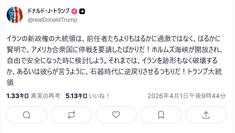 | … | 71無念Nameとしあき26/04/02(木)00:08:47No.1397972930+トランプ大統領はまた、空爆で最高指導者アリー・ハメネイ師が殺害された後、イランの新指導者たちとの合意への希望を表明した。 |