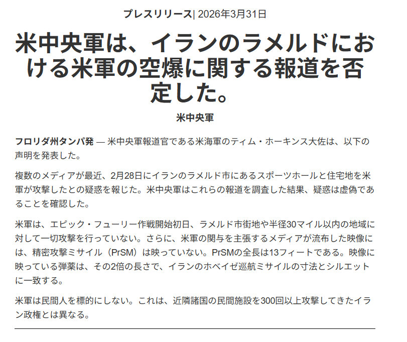 | … | 56無念Nameとしあき26/04/01(水)23:13:01No.1397963891+ 1775052781120.png-(866711 B) >CENTCOMが公式には否定 |