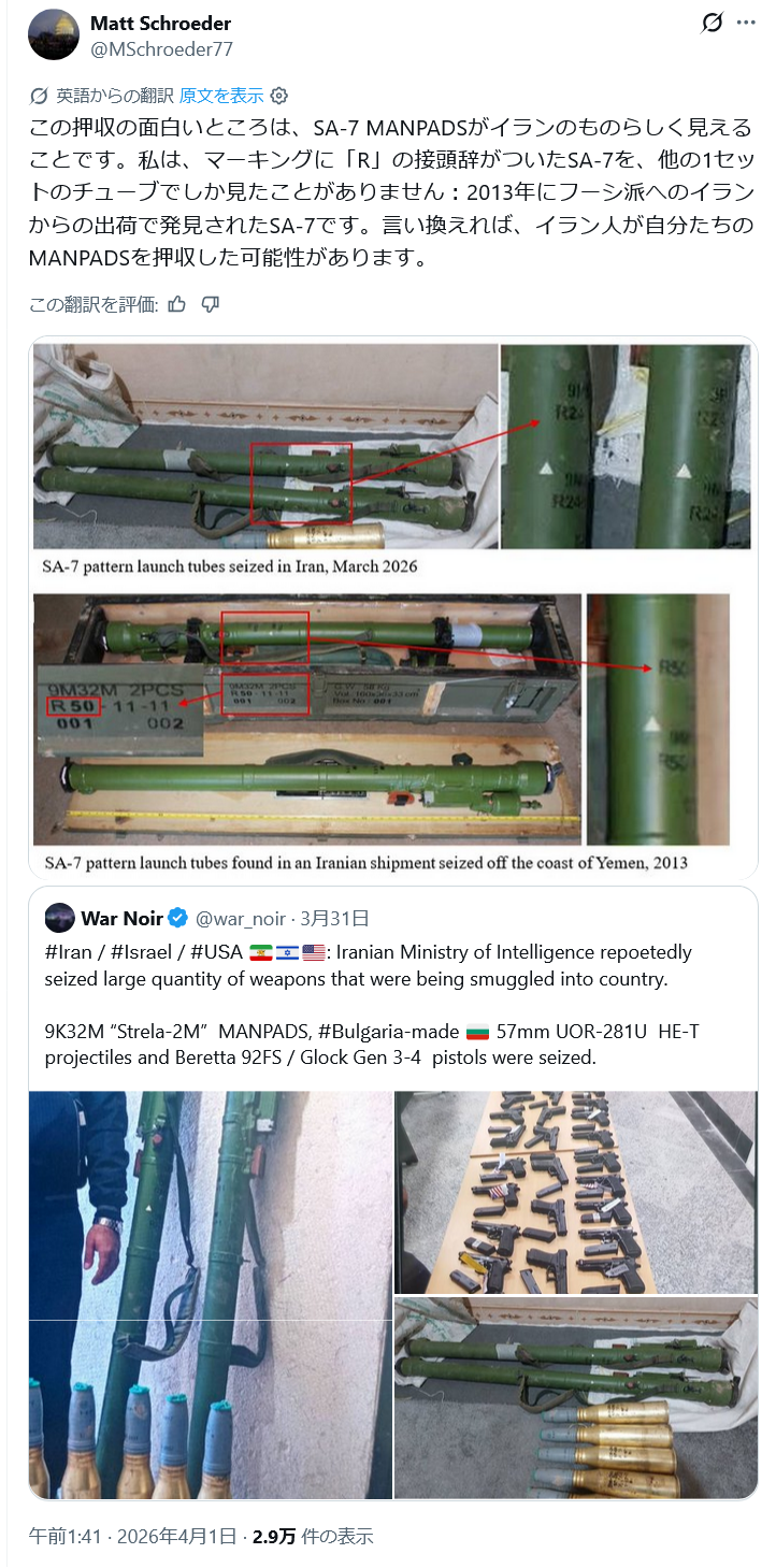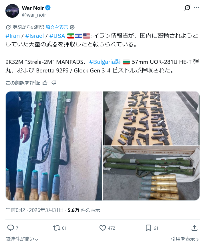 | … | 64無念Nameとしあき26/04/01(水)23:37:31No.1397968154+ 1775054251630.png-(1193776 B) >イラン当局が密輸されようとした武器を押収 |