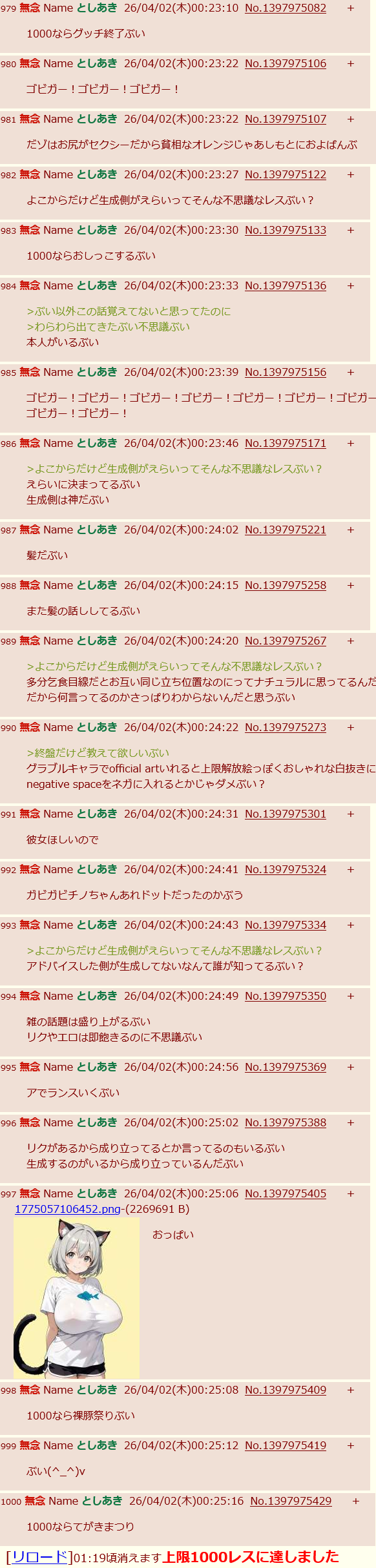 | … | 82無念Nameとしあき26/04/02(木)02:07:55No.1397985176+なんか今日はスレが長持ちぶい? |