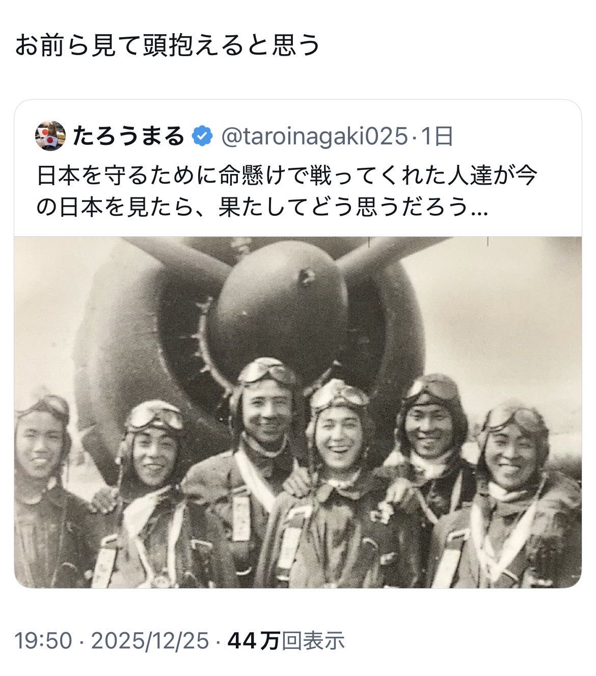 | … | 28無念Nameとしあき26/04/02(木)15:09:13No.1398062605そうだねx1 1775110153257.jpg-(193394 B) >これが命を懸けて守った日本の末裔です… |