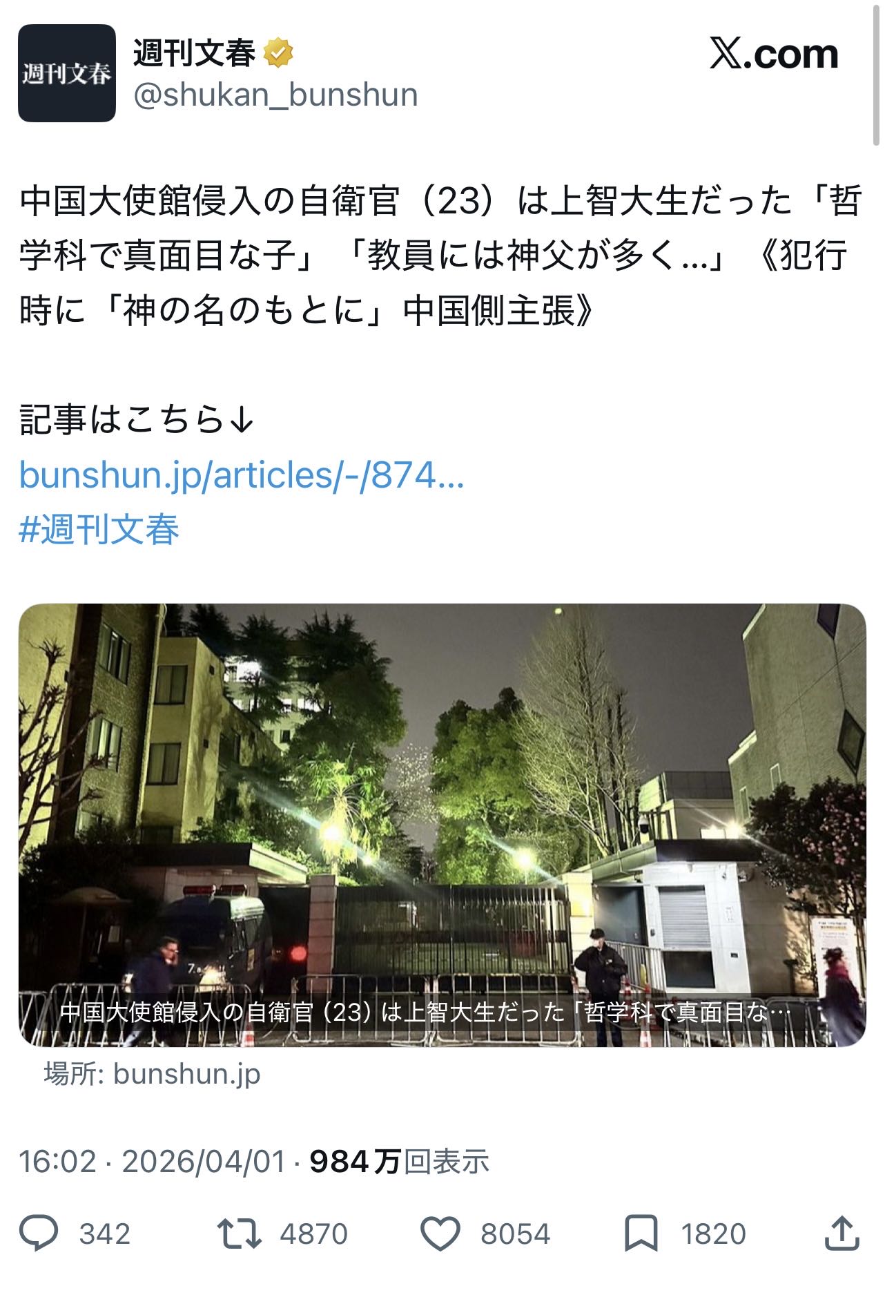 | … | 135無念Nameとしあき26/04/02(木)16:41:02No.1398075929そうだねx2大使館に武器持って突撃してる時点で頭のおかしい奴なのは確かだったが |