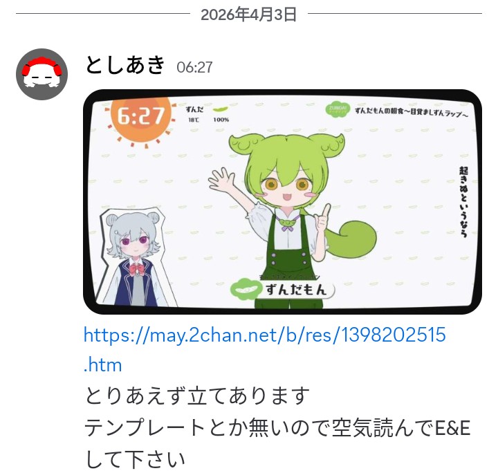 | … | 26無念Nameとしあき26/04/03(金)08:09:34No.1398209988+東北ずんだ子 |