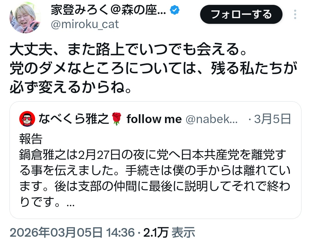 | … | 18無念Nameとしあき26/04/03(金)07:41:11No.1398207372そうだねx2>結局共産党はしばき隊を手放す気ないんだろ |